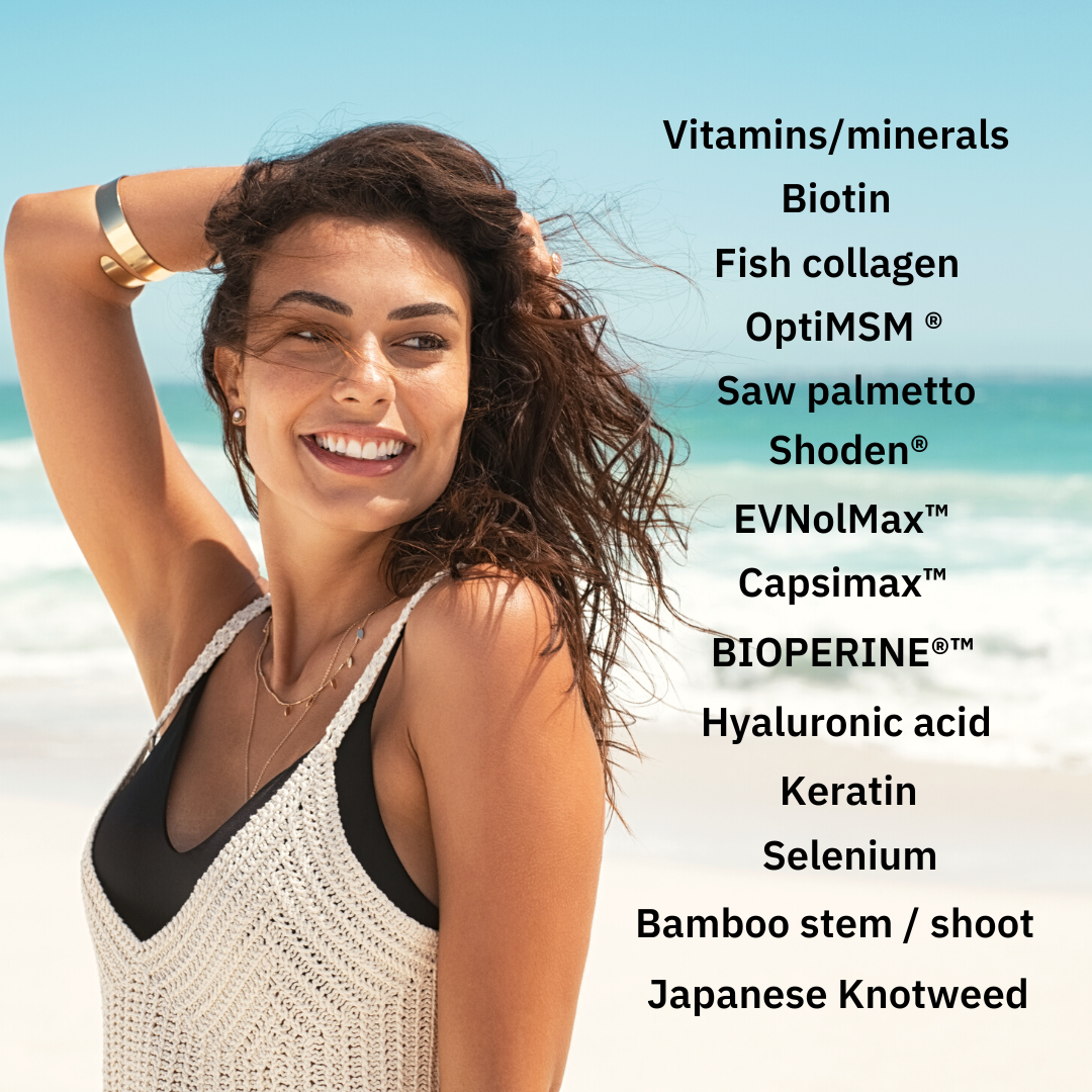 "I’m happy to see more new growth around my hairline. This hair vitamins is stimulating regrowth! I also notice less hair loss and my nails are stronger- an added bonus! The antioxidants, protein, minerals and hyaluronic acid must be feeding my hair well. "- Jamie, 32